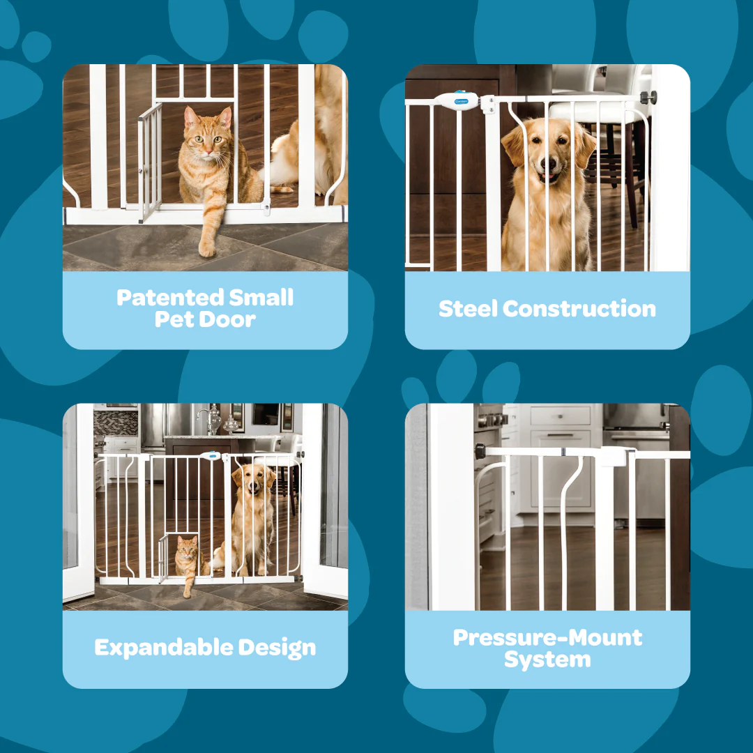 The included 6” and 12” extensions adapt to various doorways and halls. Our patented small pet door enables small animals to pass through while keeping larger pets secure. For more information on product dimensions, refer to the Product Specifications below.